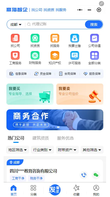 赢猎企业服务平台以“全场景、全周期、全链路”为核心理念,深度整合公司转让信息服务,工商服务、财税管理、法律支持、建筑资质信息、流量赋能六大核心模块,打造企业从初创到成熟、从危机到机遇的一站式解决方案。无论您是寻找优质在售公司、处理紧急工商异常,还是规划知识产权布局,赢猎平台都能精准匹配需求,让企业运营无忧。